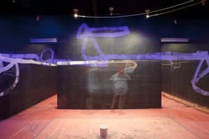 Contributed by Sharon Butler / It’s one thing to understand the empiricist philosophers’ notion that the observed and the observer cannot really be separated, quite another to vivify it through visual art. But in The Nearly Endless Line, a new installation at Sue Scott Gallery, Pat Steir does just that, with both subtlety and force. A mildly agitated, wide white line snakes around the walls of the darkened gallery at eye level. The walls themselves, painted with layers of flat, burnished blue-black paint, seem to recede like a dark sea into the night, while the line, lit with blue light (a technique she has used before), appears to hover untethered in the space. But at no point can viewers see the whole line, so they must follow it through the gallery, into the back room, and ultimately back to the beginning. At once a path forward and a record of the past, the line is painted with an elegantly brushy stroke that intermittently loops back on itself to form knotty snarls and kinks. Walking through the darkened space, observers find themselves inside Steir’s painting, where they become part of the illusion she has created with paint and light. The “nearly endless line” scans convincingly as life itself.